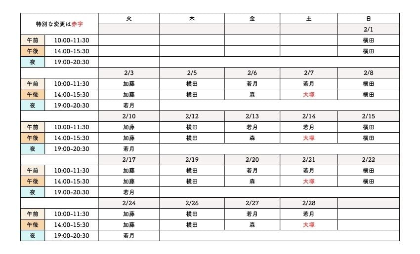 ▼ 2025年12月更新版の、講師スケジュールです。火曜夜、金曜朝、土曜の講師は若月先生、火曜午前/午後の講師は加藤先生、金曜午後の講師は森先生、木曜、日曜の講師は、横田先生になります。
