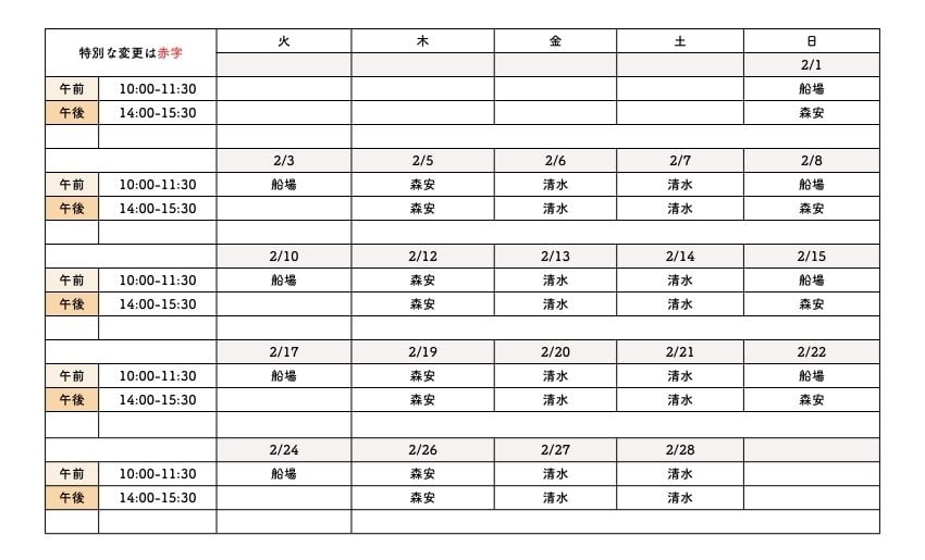 | 10:00-11:30 | 船場 | 森安 | 清水 | 清水 | 船場 |