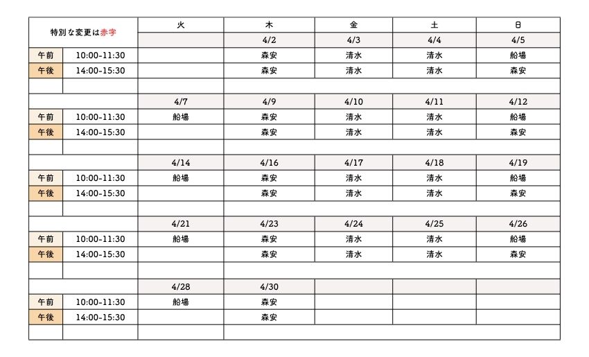 | 10:00-11:30 | 船場 | 森安 | 清水 | 清水 | 船場 |