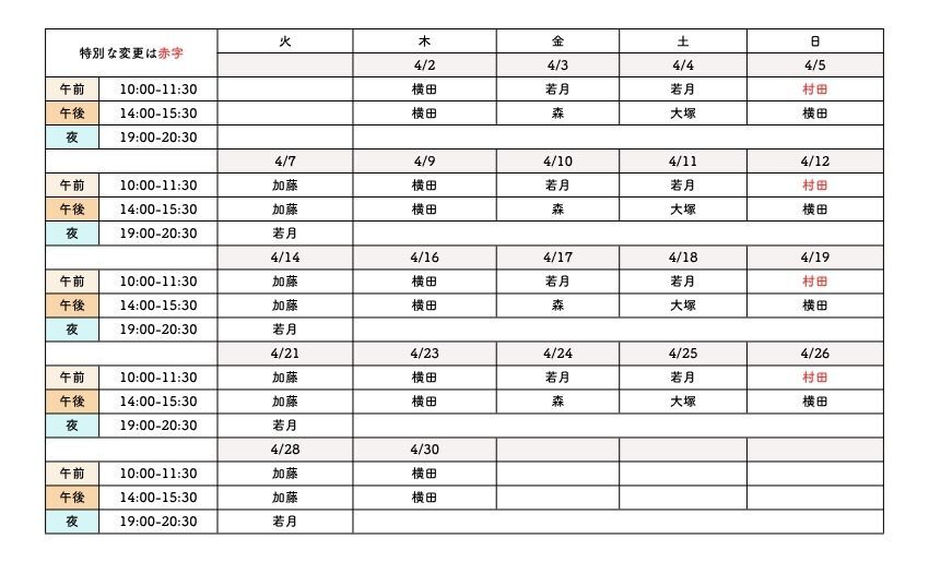 ▼ 2025年12月更新版の、講師スケジュールです。火曜夜、金曜朝、土曜の講師は若月先生、火曜午前/午後の講師は加藤先生、金曜午後の講師は森先生、木曜、日曜の講師は、横田先生になります。